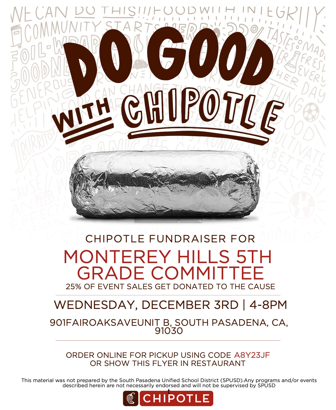 5th Grade Fundraiser - CHIPOTLE - Wed. Dec. 3 South Pasadena Location, from 4pm - 8pm; Use CODE A8Y23JF