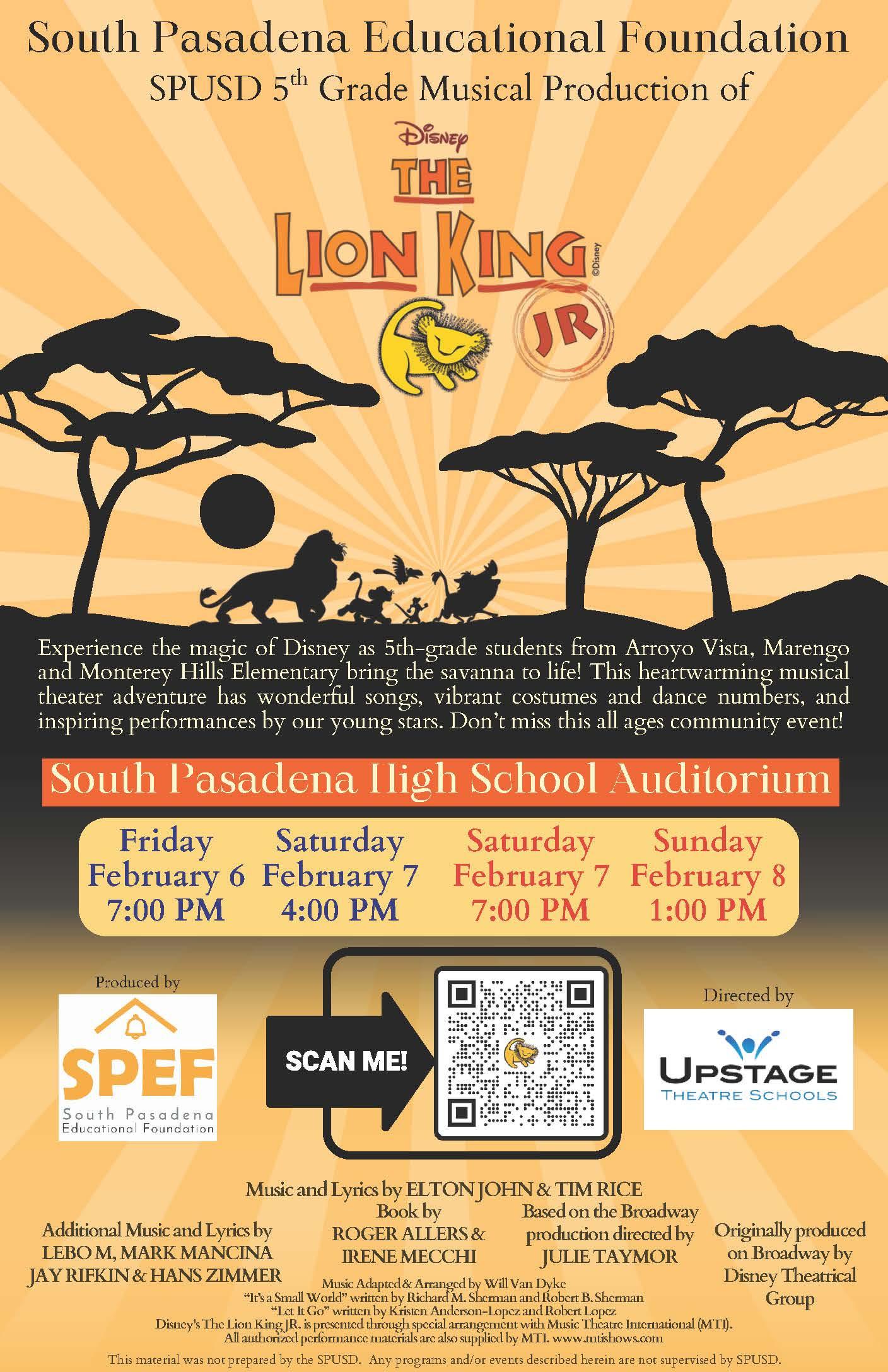 SPEF - 5th Grade Musical Production of Disney The Lion King: Feb. 6 - 8 MHS, AV & MAR students will be performing over 3 days. For tickets...