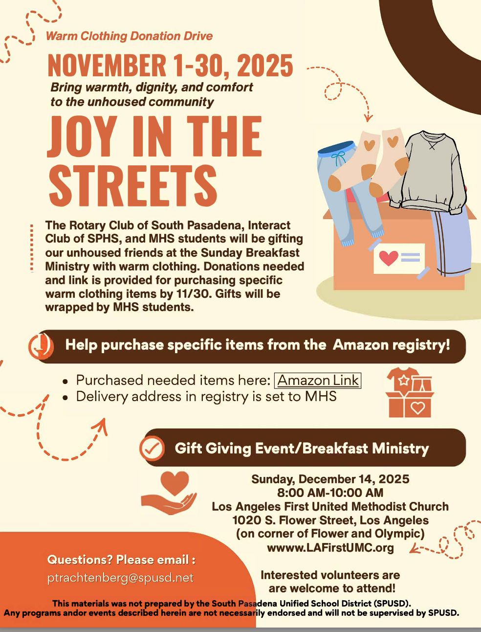 Warm Clothes Donation Drive - November AMAZON LINK, CLICK HERE Any questions: Mrs. Trachtenberg, MHS 3rd Grade Teacher: [email protected]
