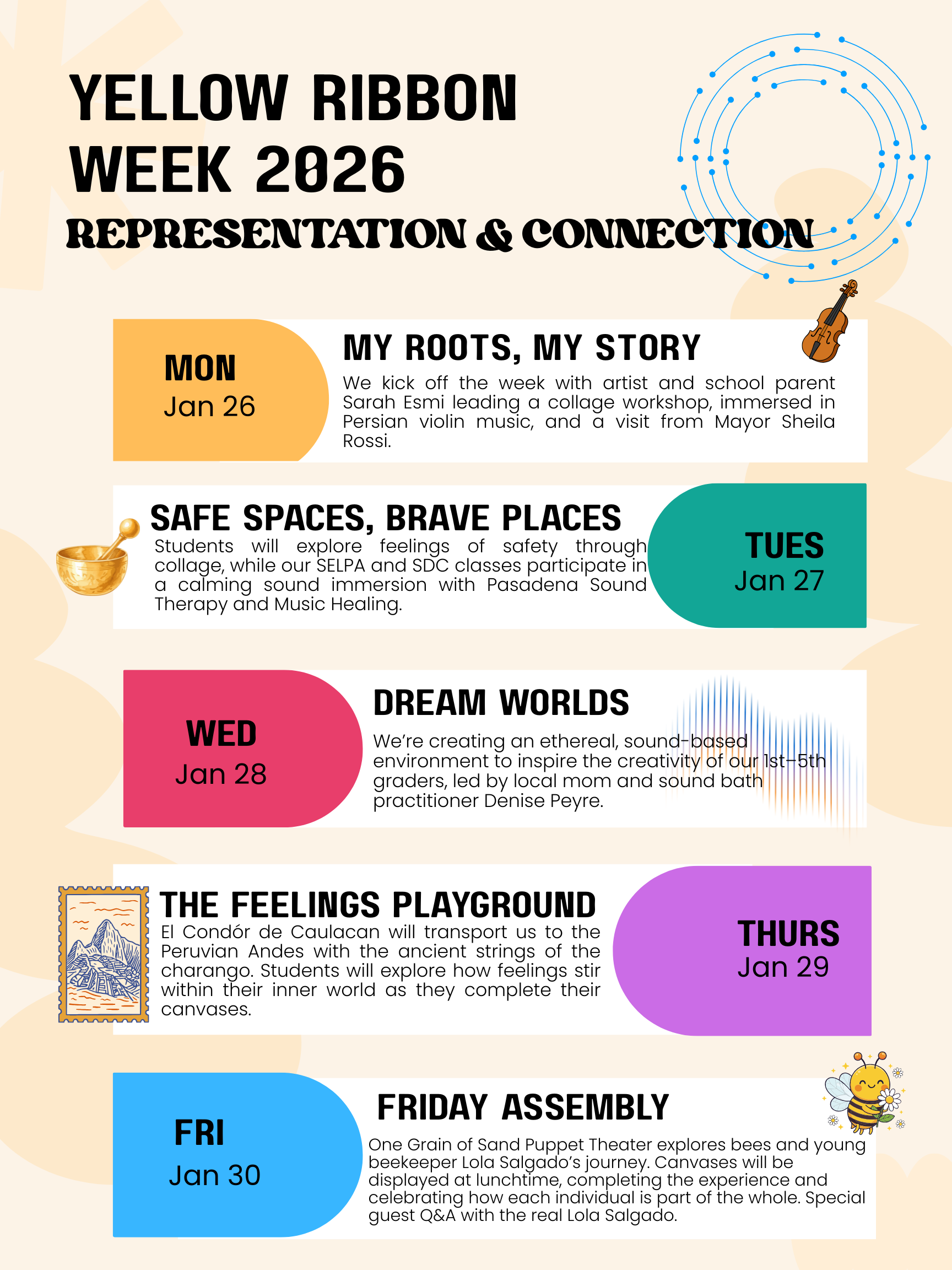 This year’s theme is representation & connection, a joyful celebration of identity, creativity and community. Through music, art and multicultural expression, students can discover the powerful ways that culture shapes who we are and how creativity becomes a universal language when words are hard to find. This week encourages students to uplift one another through: